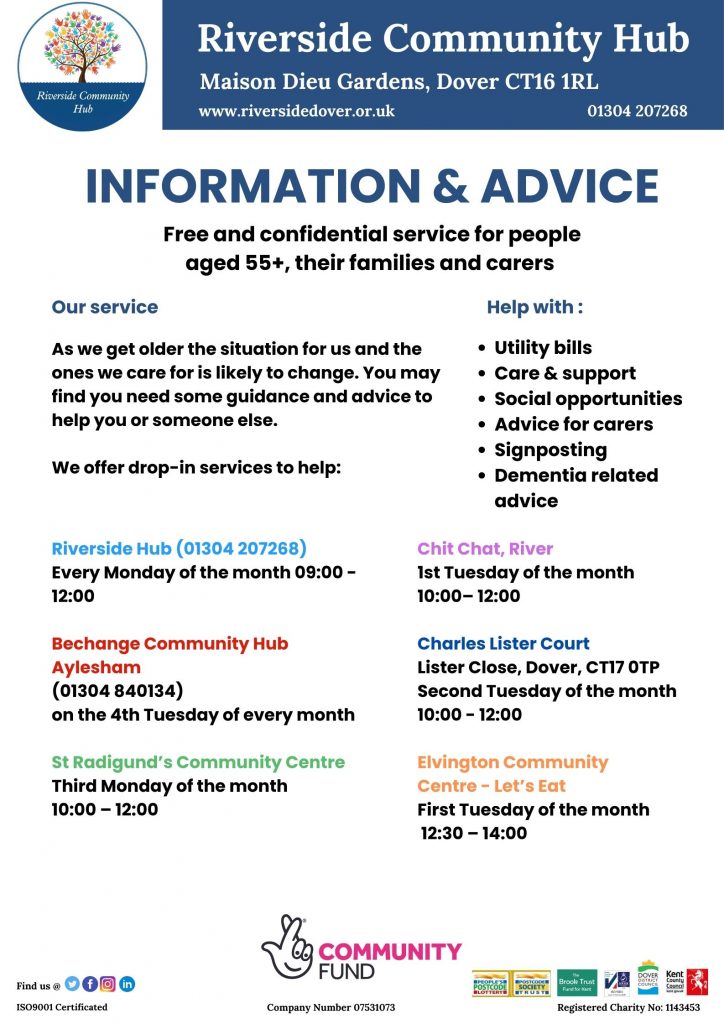 The information and advice provided by Age Concern Dover Ltd TA The Riverside Community Hub through our Info & Advice service is given in good faith and is based on our knowledge and experience. However, we do not claim to be experts or qualified professionals in legal, financial, medical, or other specialist fields.